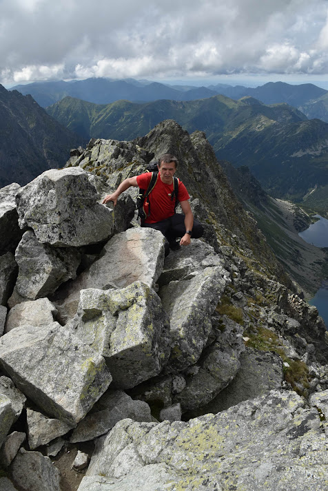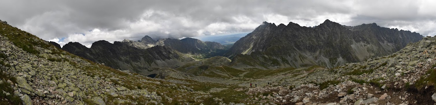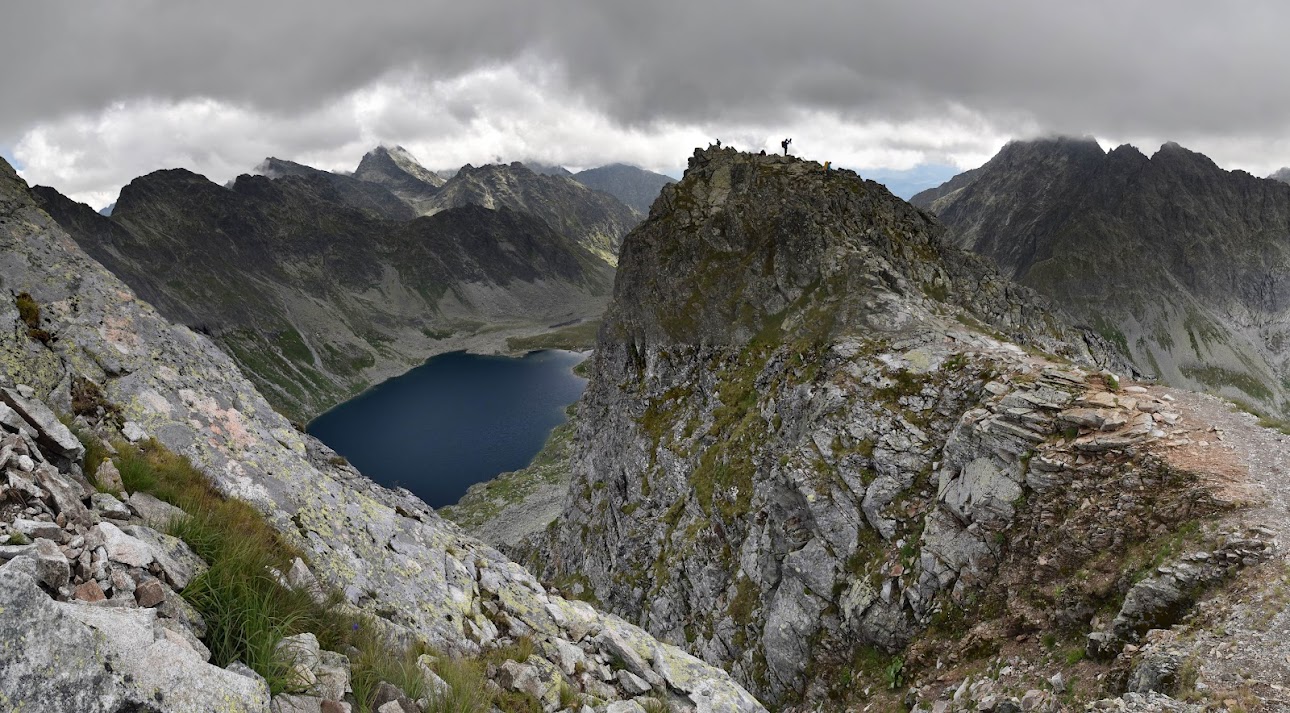 Za nami Przełęcz pod Chłopkiem z widoczną po prawej stronie niewielką turniczką- Chłopkiem. Na prawo od Przełęczy- Mięguszowiecki Szczyt Czarny, na lewo Mięguszowiecki Szczyt Pośredni.