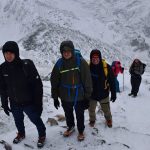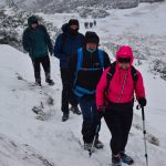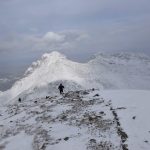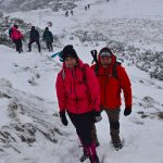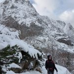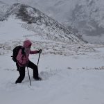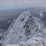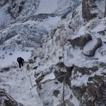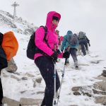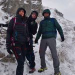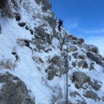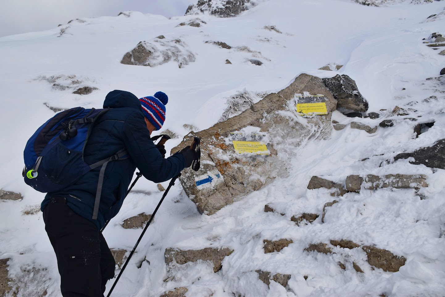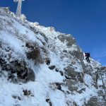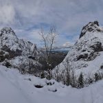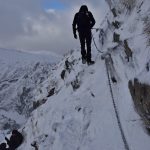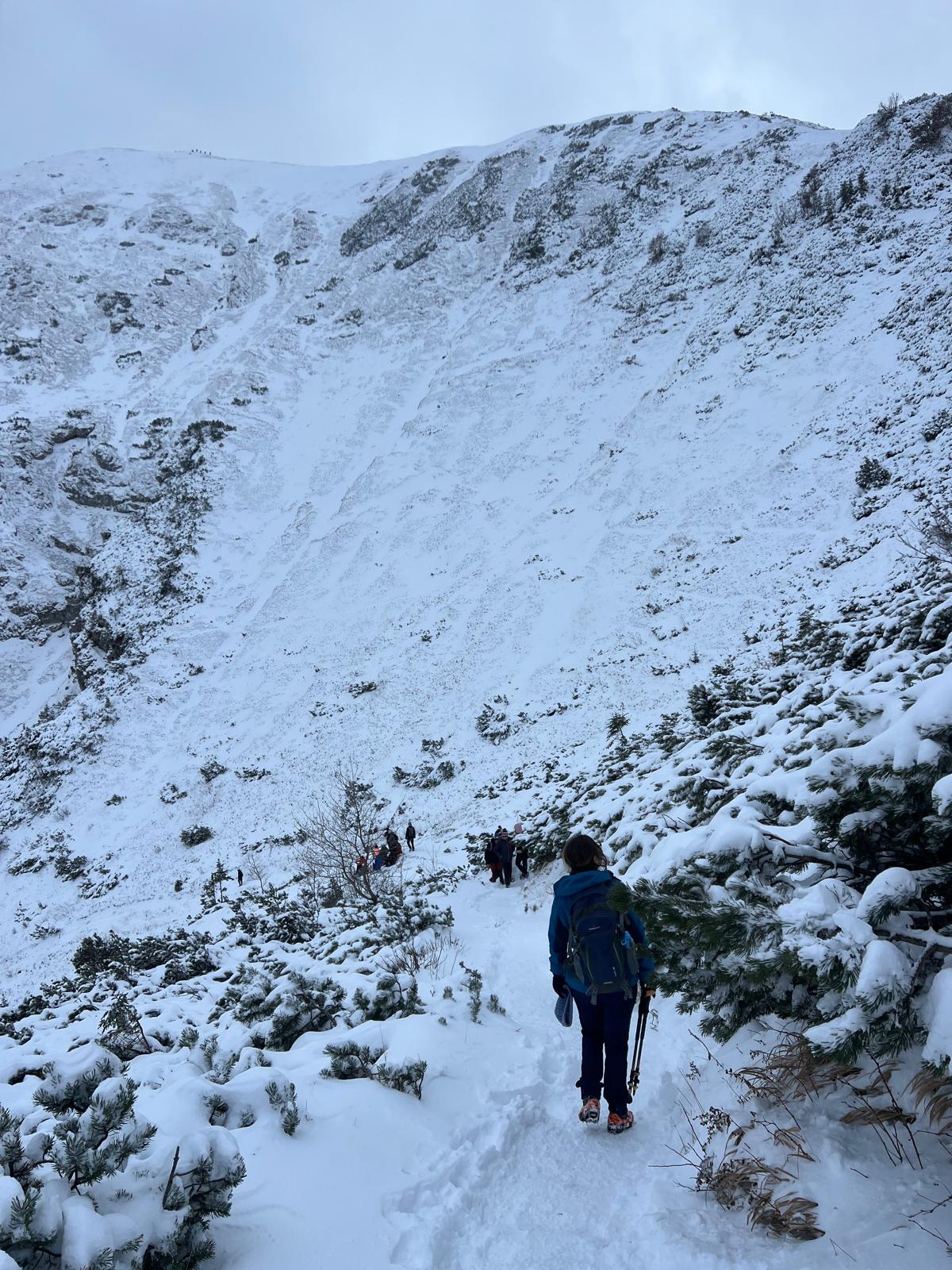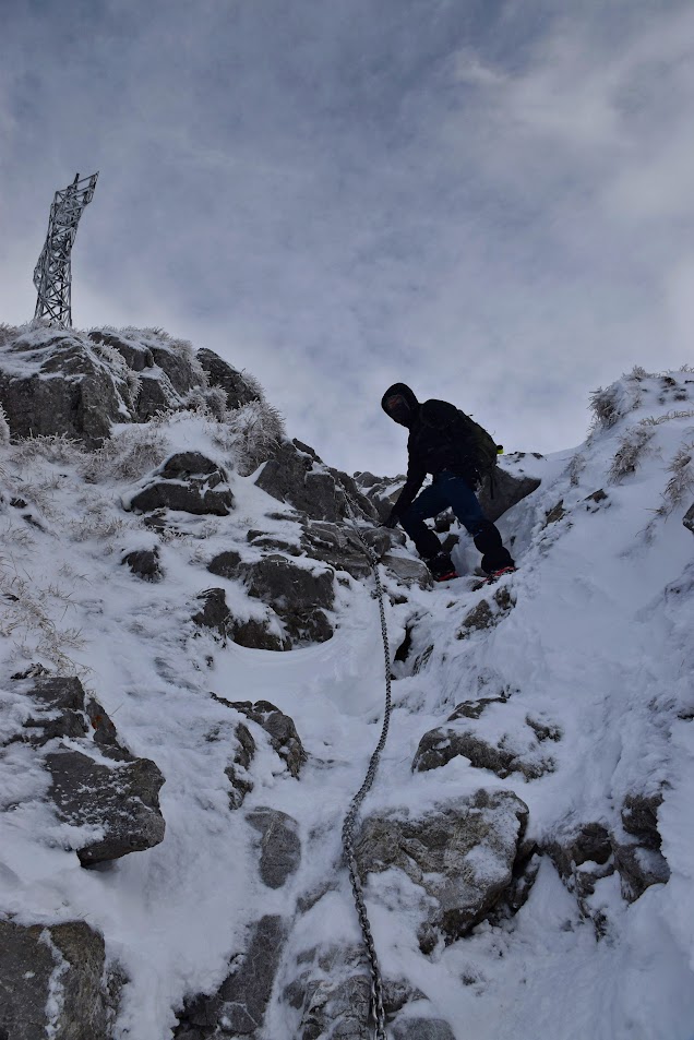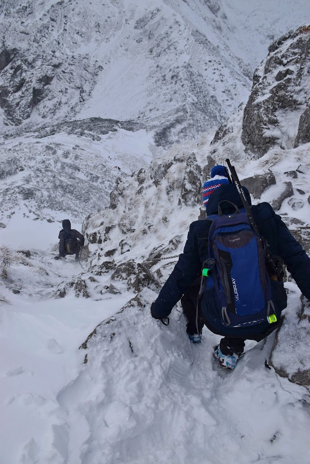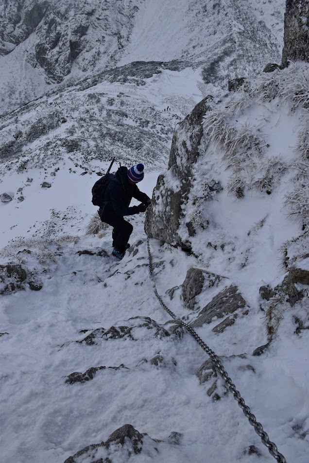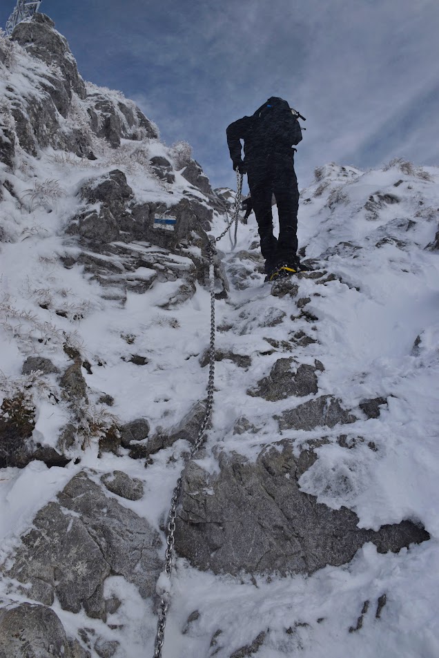 Ledwie zaczynamy wspinaczkę, zrywa się nieprzyjemny wiatr, jakby złośliwie, wiejący śniegiem prosto w oczy. Żałujemy, że nie pomyśleliśmy o goglach. Ręce ślizgają nam się na zimnych, oblodzonych łańcuchach, mimo sportowych rękawiczek. Ściągnąć ich nie ma możliwości, chyba że kosztem odmrożenia dłoni…