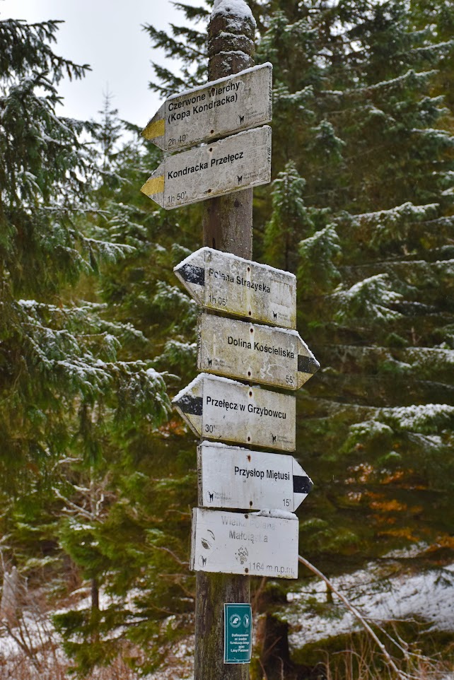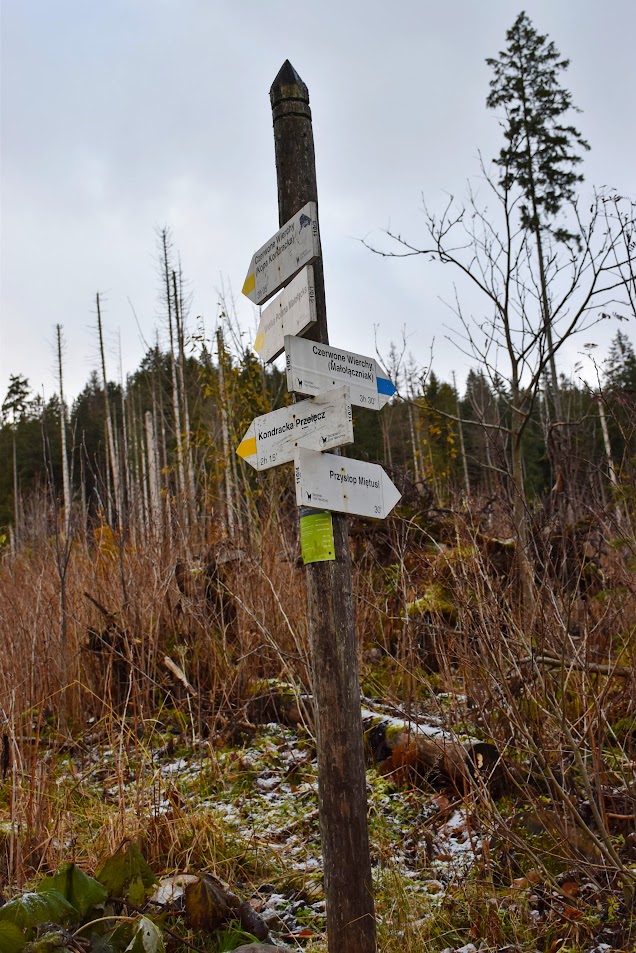 Pierwsze rozwidlenie szlaków. Zgodnie z planem będziemy trzymać się żółtych znaków, aż do Kondrackiej Przełęczy.