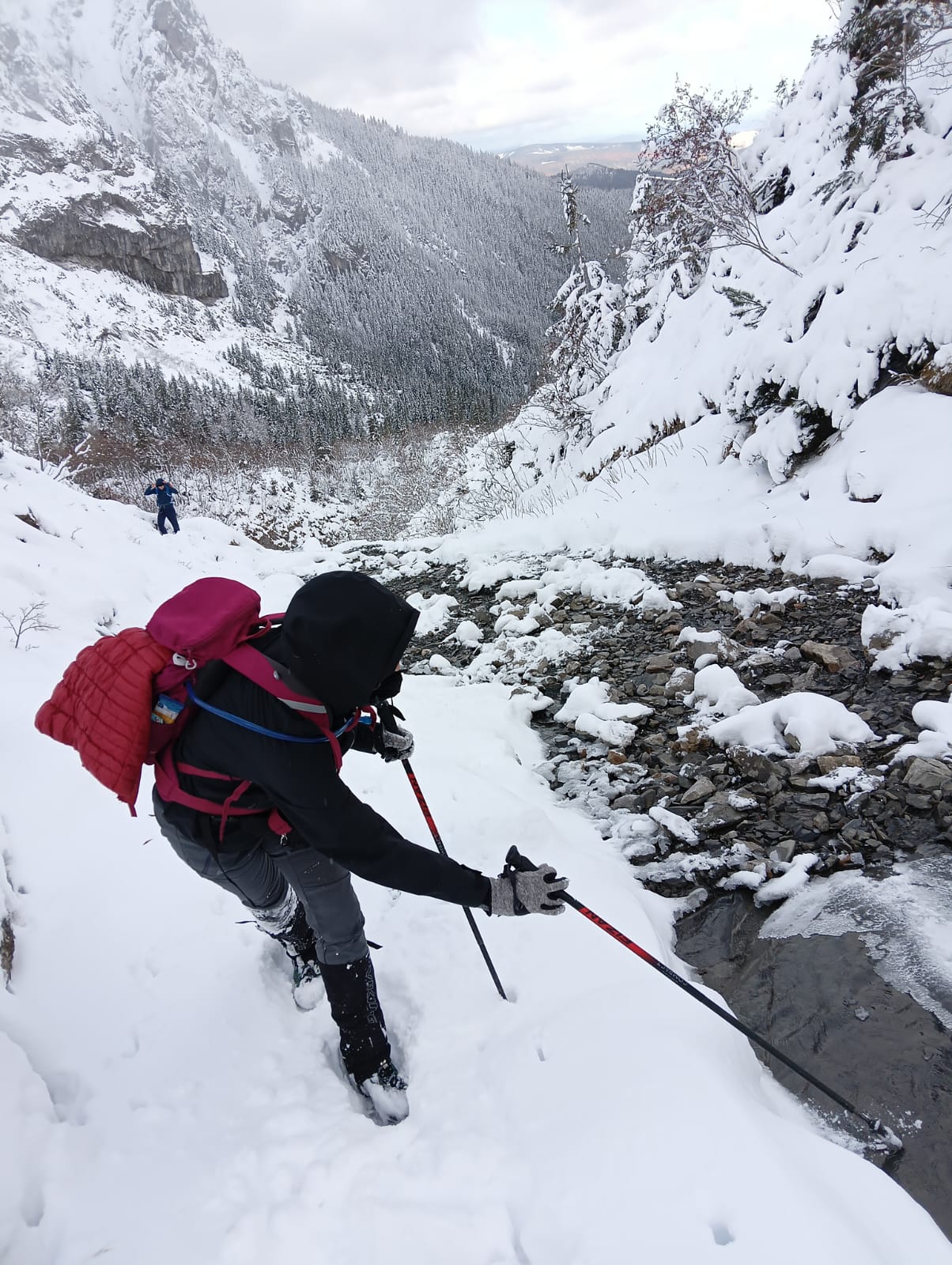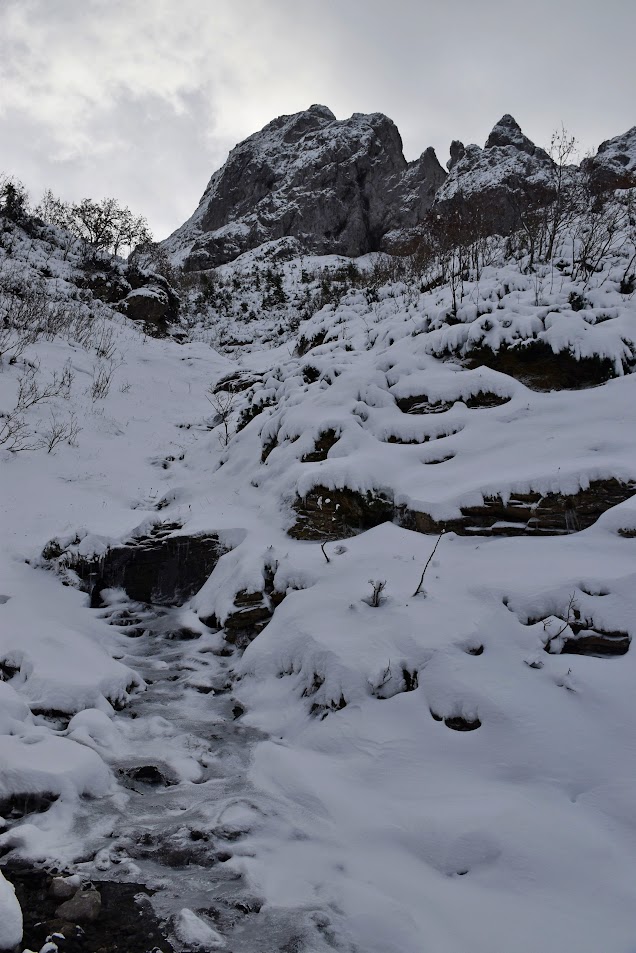 Jesteśmy rozgrzani i nie czujemy zimna, ale na termometrze z pewnością jest poniżej zera. Okresowy potok, wzdłuż którego prowadzi szlak, pokrywa warstwa lodu.