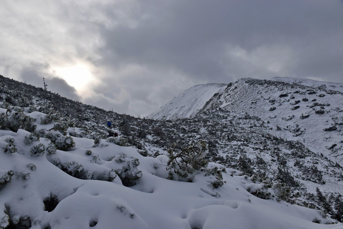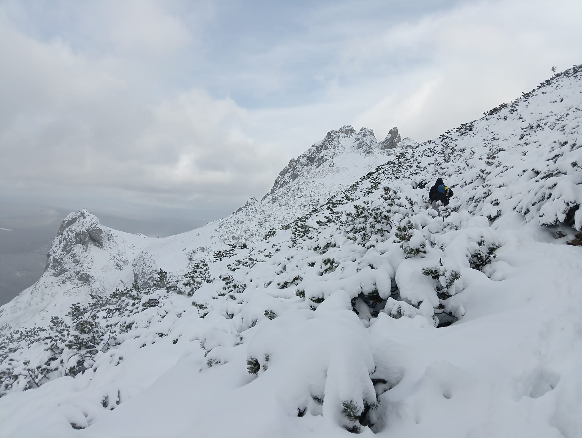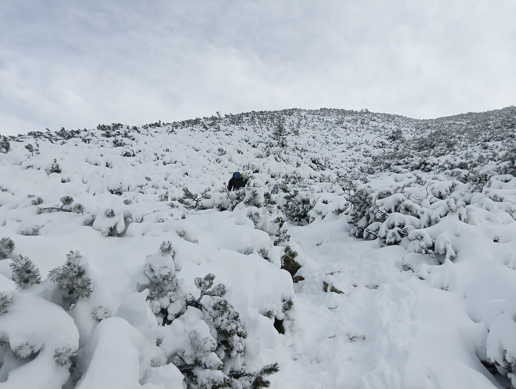 W najwyższych partiach Doliny śnieg przykrywa grubą warstwą połacie kosodrzewiny jak puchowa kołderka.