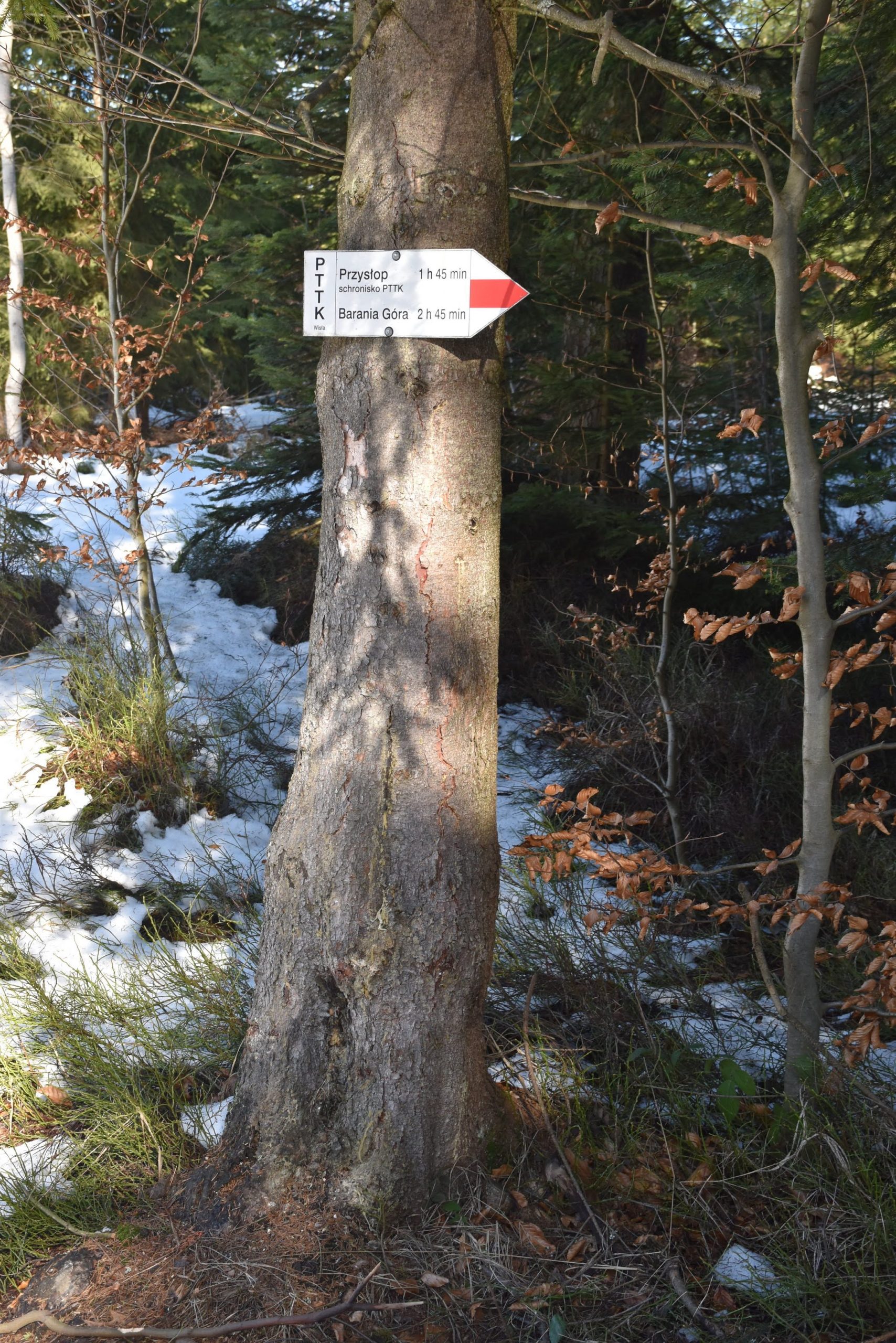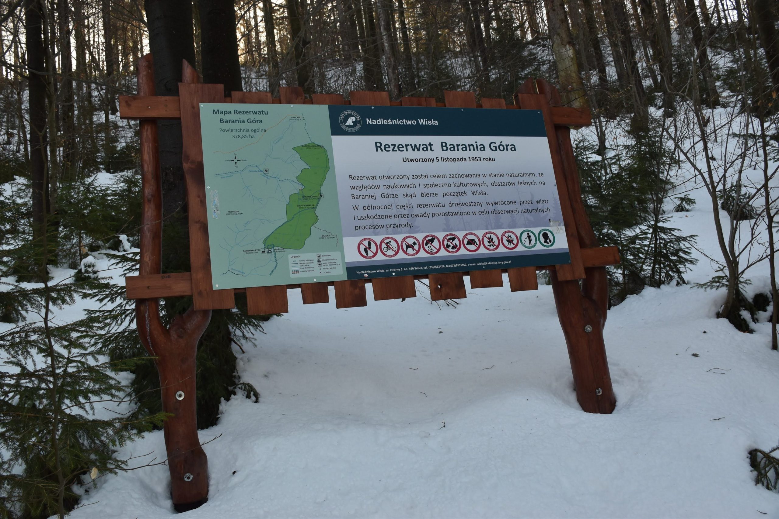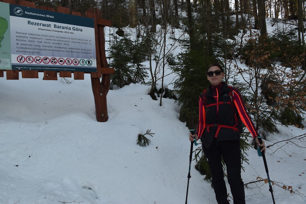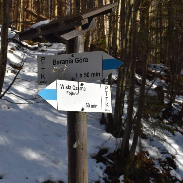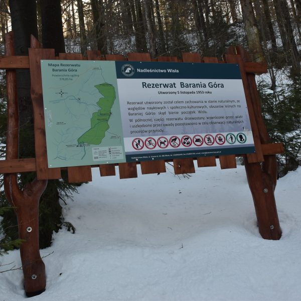 Szlak skręca w prawo i zaczynamy trawersować zbocza Baraniej Góry. Na jej stokach istnieją dwa rezerwaty przyrody: wspomniany Rezerwat Wisła oraz Rezerwat Barania Góra, obejmujący szczytowe partie.