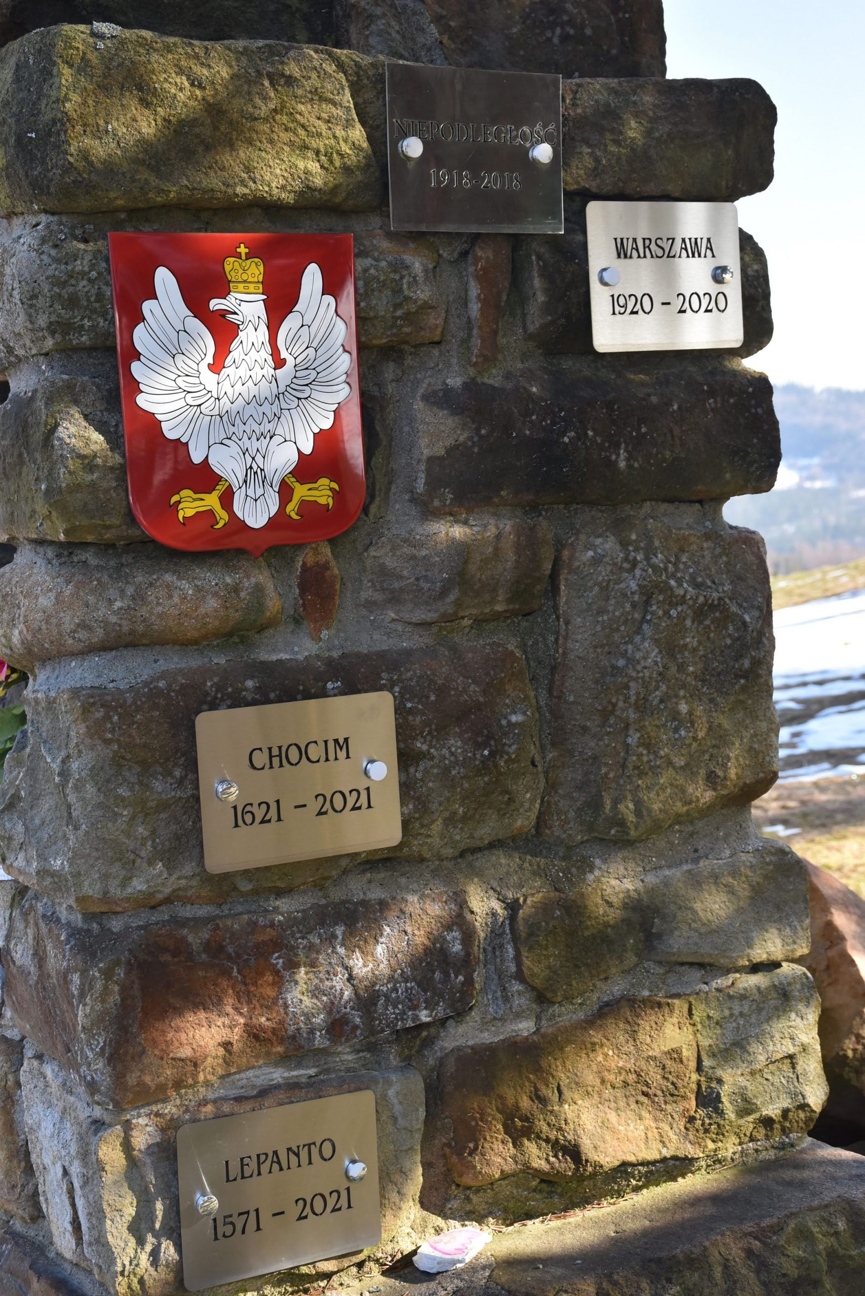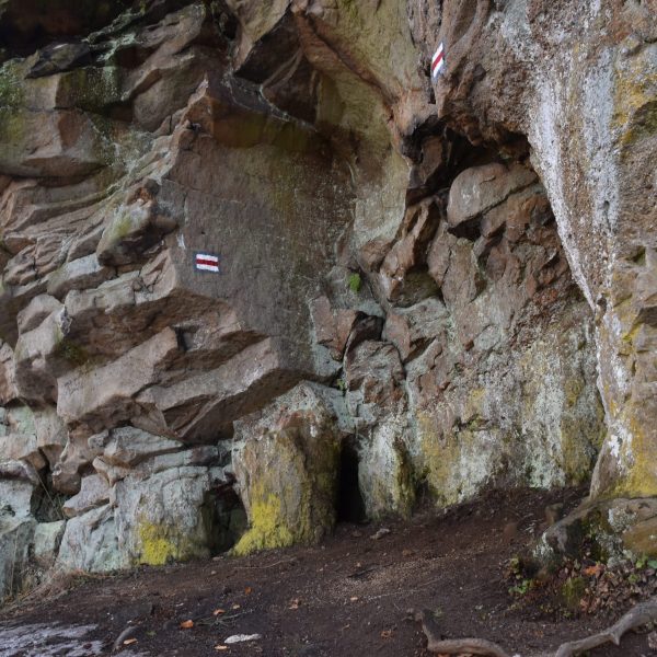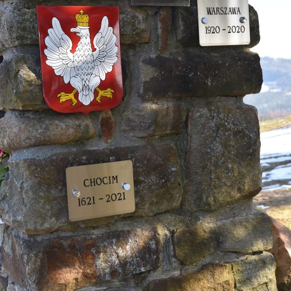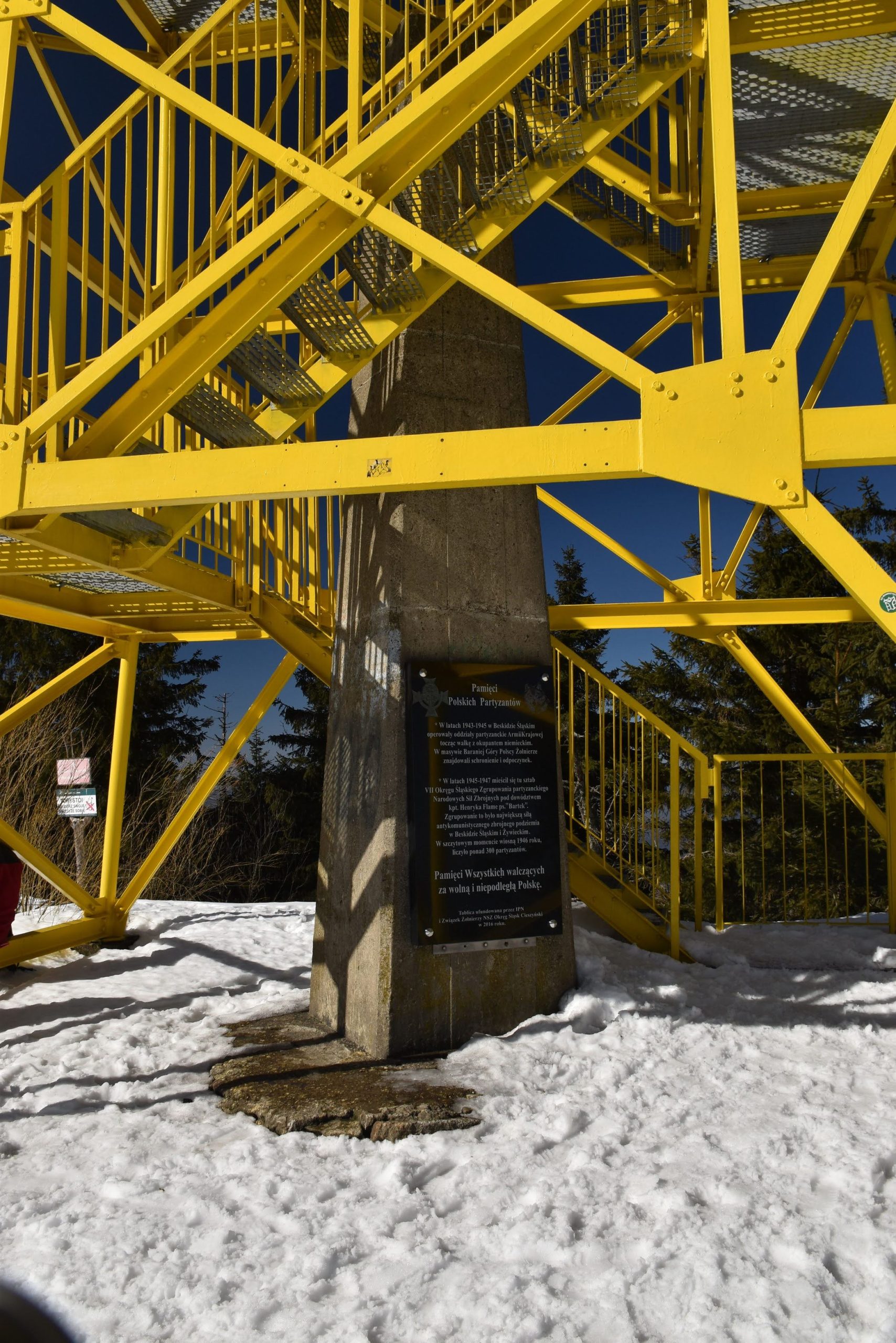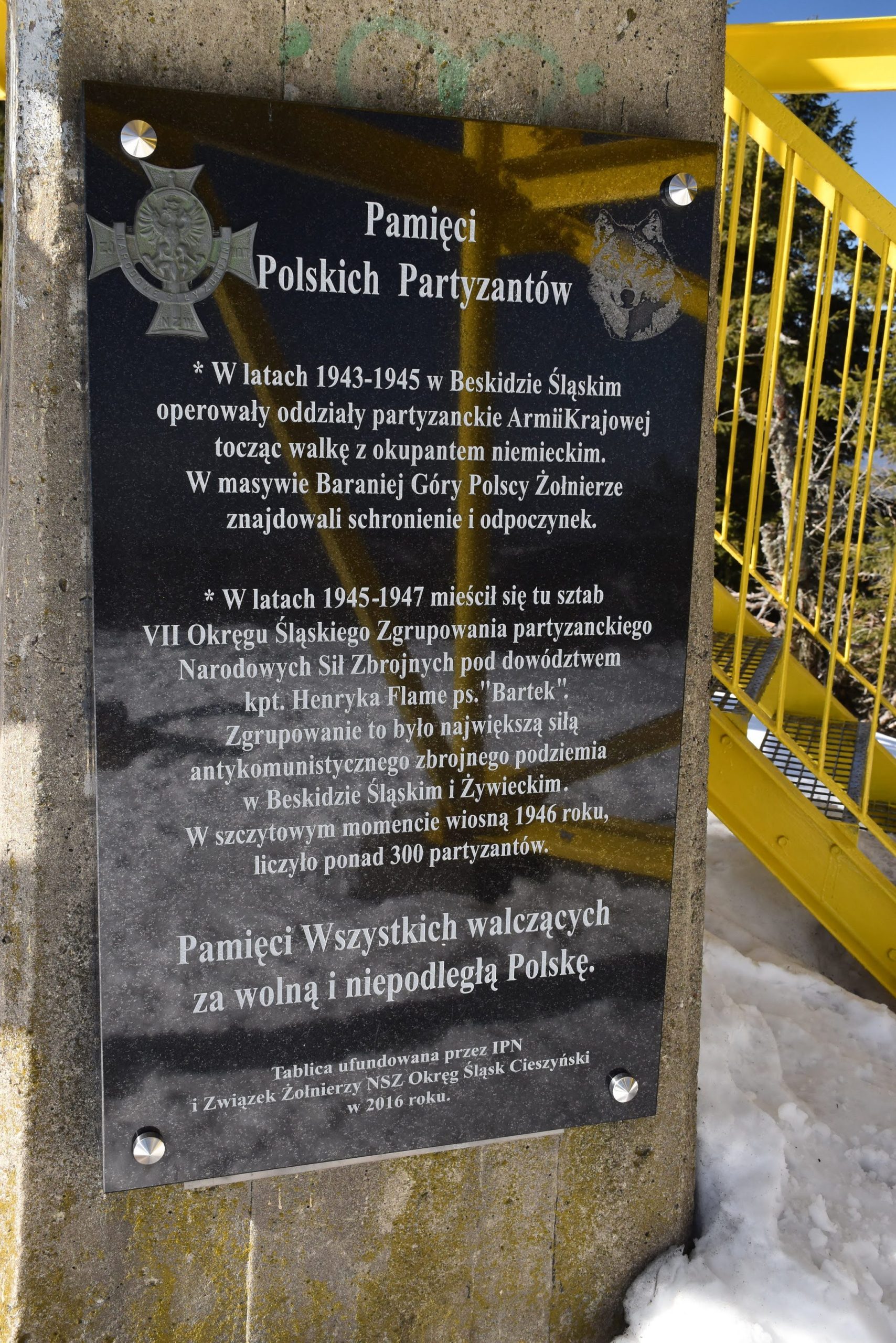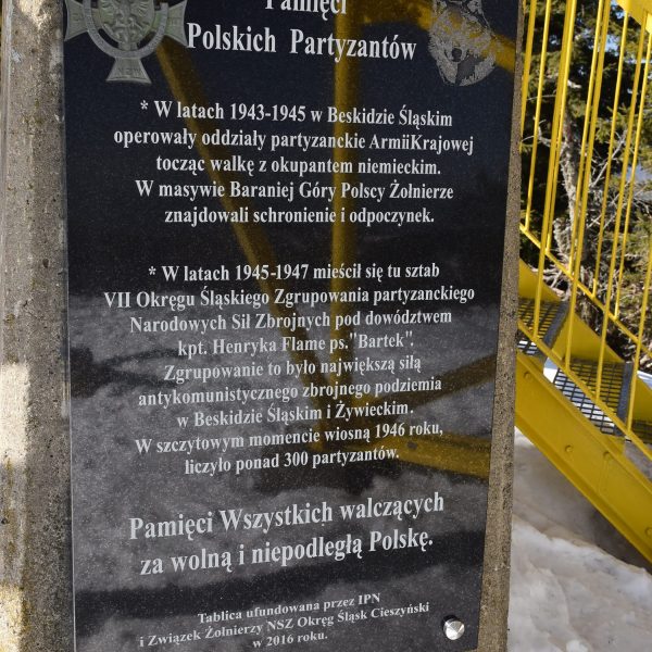 Przy zejściu, u podnóża schodów, dostrzegamy tabliczkę upamiętniającą polskich partyzantów.