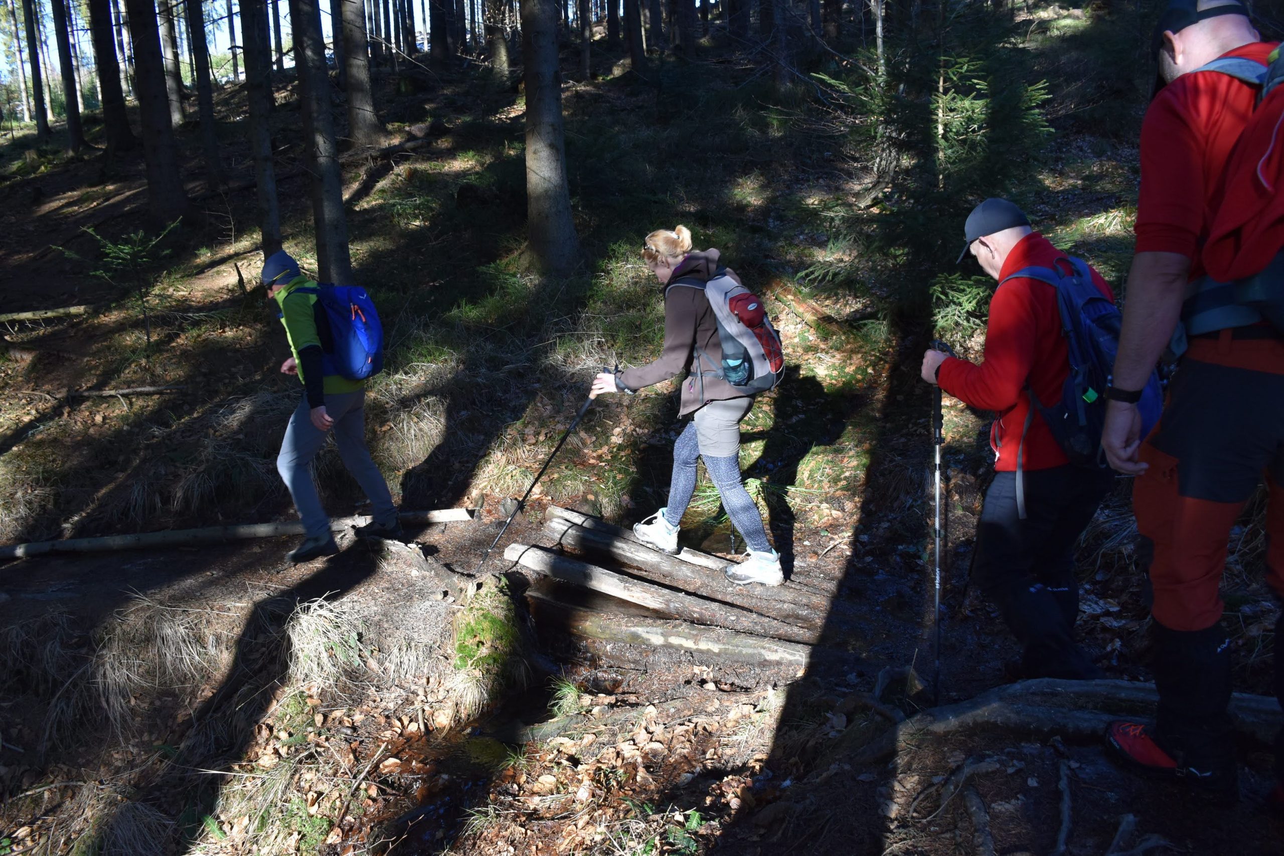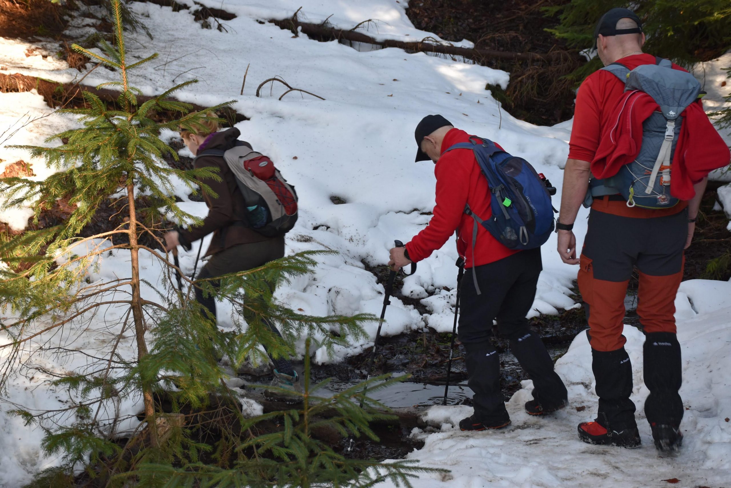 Teren robi się coraz bardziej grząski i szukamy sposobu, by sprawnie i bez zamoczenia butów przeprawić się przez potok, błota i mokradła.